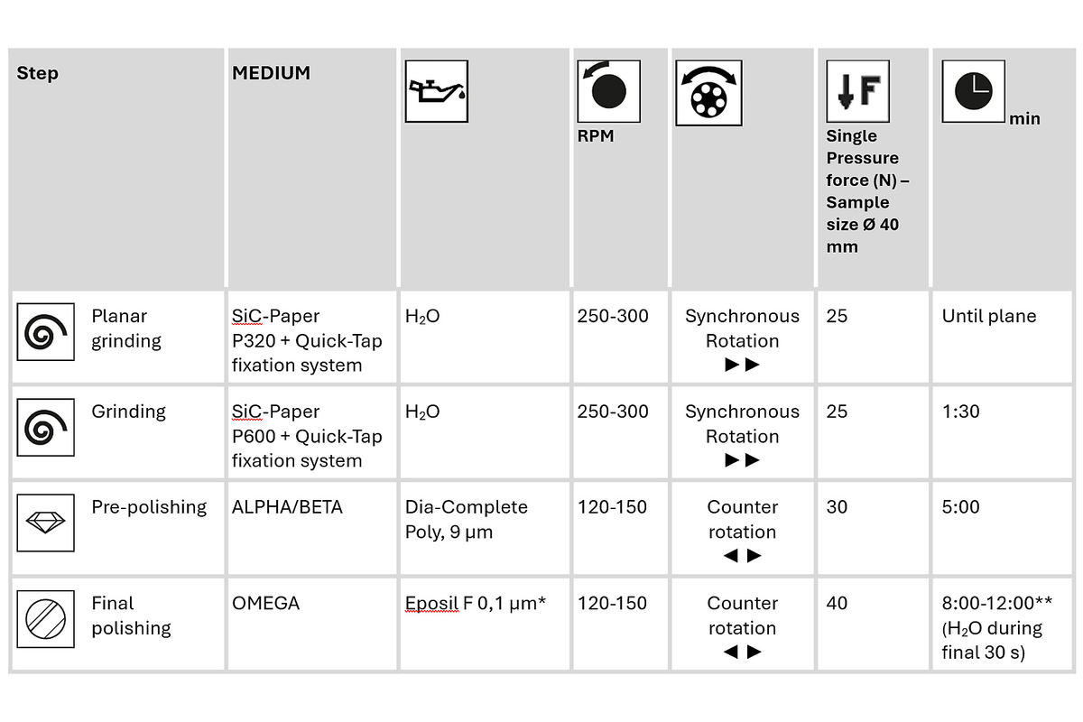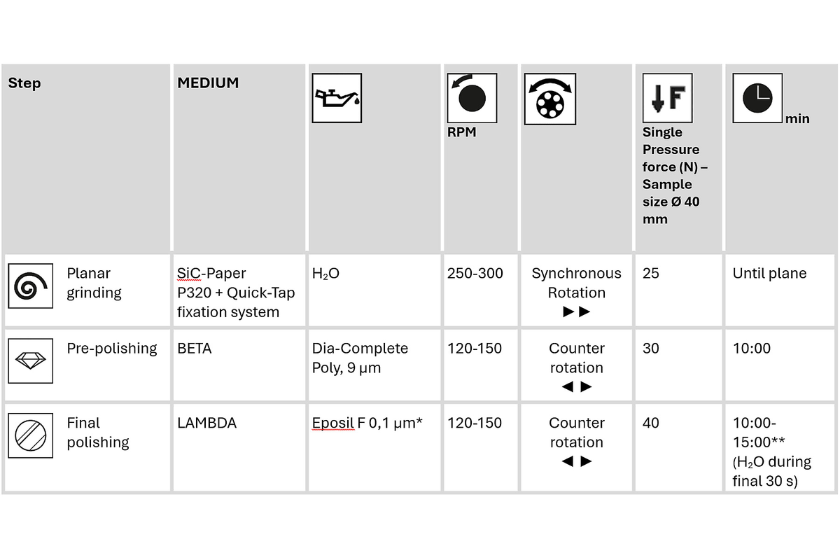 Both hot and cold mounting methods are suitable for titanium. For hot mounting, we recommend EPO BLACK, a mineral- and glass-filled epoxy resin-based material that provides excellent edge retention, minimal gap formation, and high plane parallelism, ideal for critical metallographic analysis. Alternatively, EPO MAX, with similar properties but shorter cycle times.