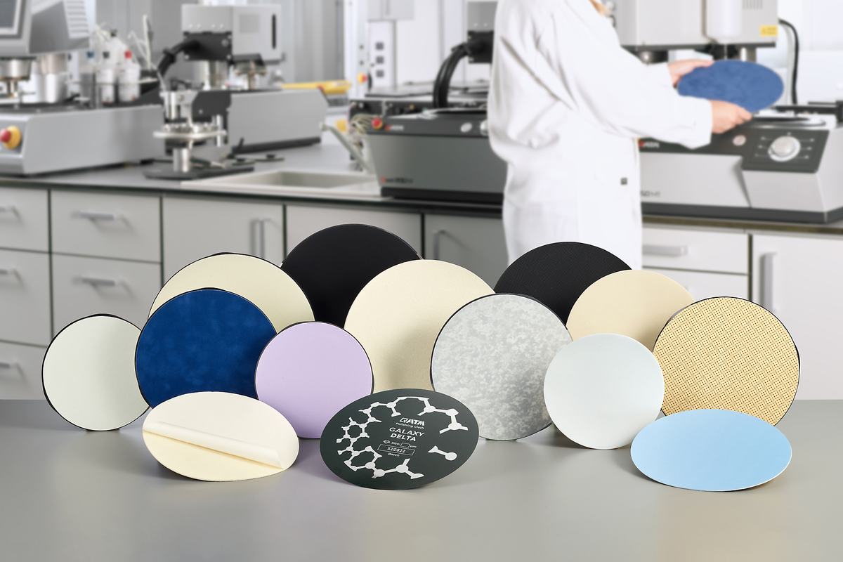 要获得无变形、无浮雕的抛光效果,选择合适的抛光布至关重要。抛光布的材料和质地(丝绸、人造丝、合成纤维、羊毛织物、毛毡、植绒或发泡合成纤维织物)以及由此产生的冲击弹性在选择合适的抛光布时起着决定性作用。可提供不同的固定系统(GALAXY 金属盘和磁性膜搭配或自粘抛光布和GALAXYX-Tap转换盘搭配使用)。GALAXY 抛光布采用 QPREP 防滑背衬,即使在高接触压力和试样夹具满载的情况下也能承受高剪切力,确保抛光过程始终稳定。