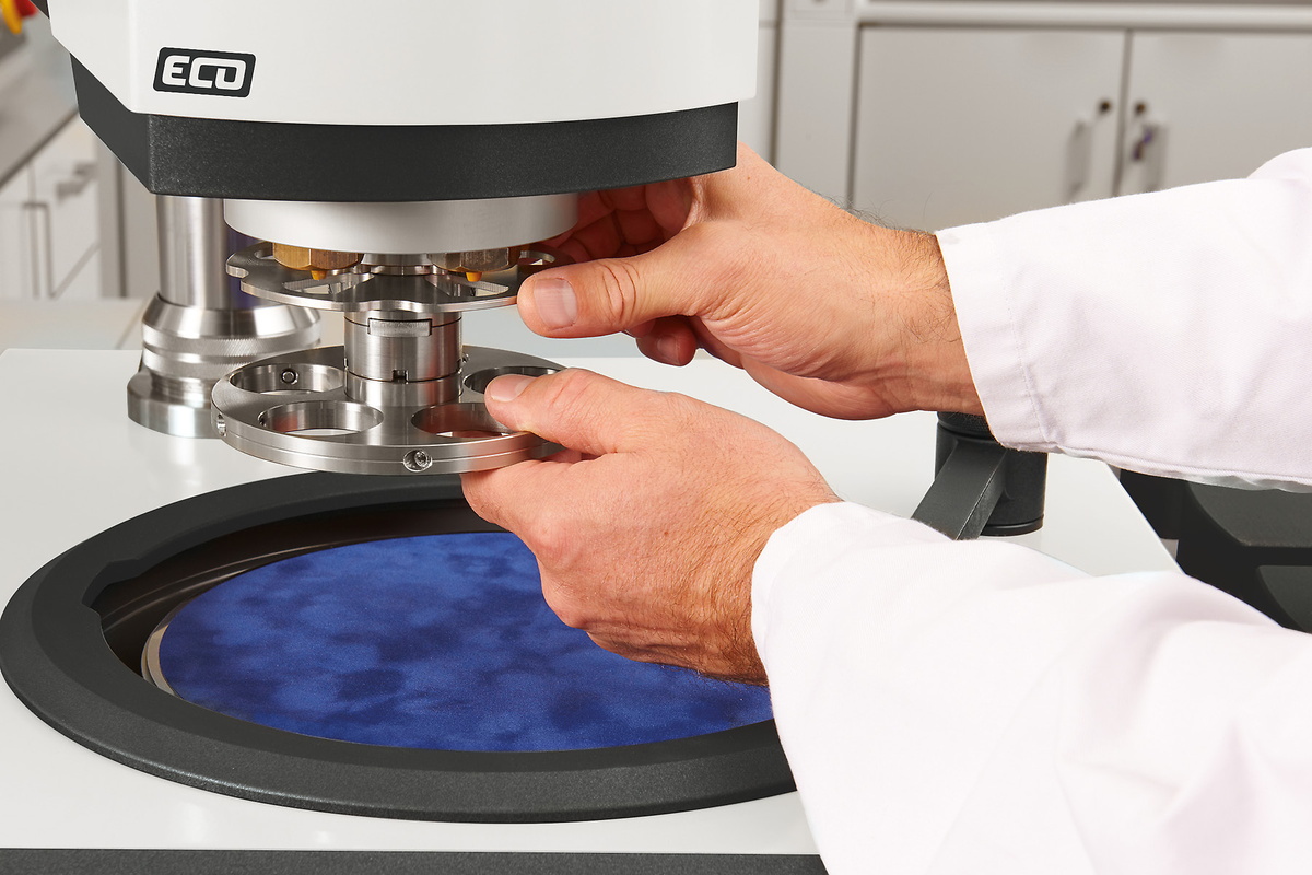 ECO 磨抛头可在单点力5-80 N 及中心力模式20-350 N下操作。能同时制备多达6个40mm直径的样品,且转速可调。试样夹具直径可达130mm。