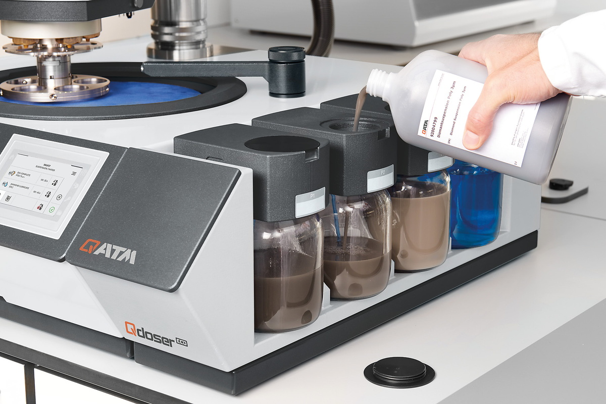 全自动加液系统Qdoser ECO和Qdoser ECO+用于配合Qpol 250/300 A系列自动磨抛机使用,可加快金相实验室的磨抛过程。 4个带螺旋盖的500毫升玻璃瓶可容纳金刚石悬浮液、润滑剂或终抛悬浮液,可通过单独的瓶盖进行填充,即使在操作期间也可以。加液瓶易于取下进行清洁。 加液喷嘴可以插入连接到磨抛头的支架中。 通过Qpol设备的软件全自动控制加液。回吸功能可使软管保持清洁。