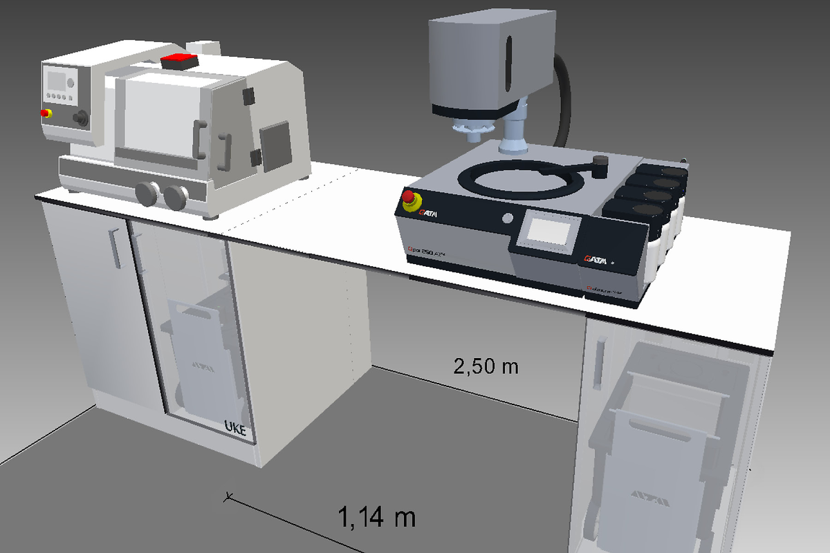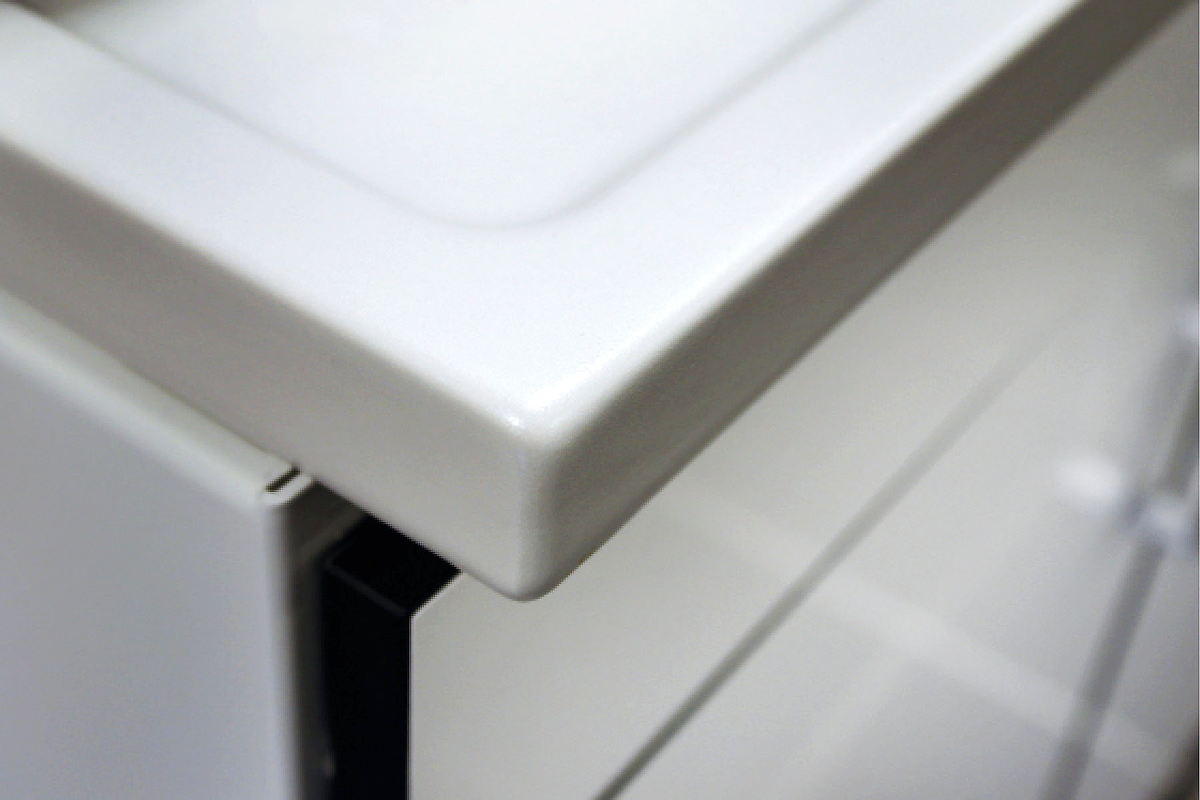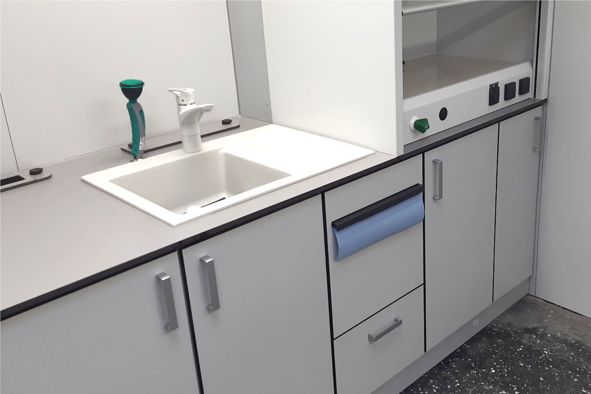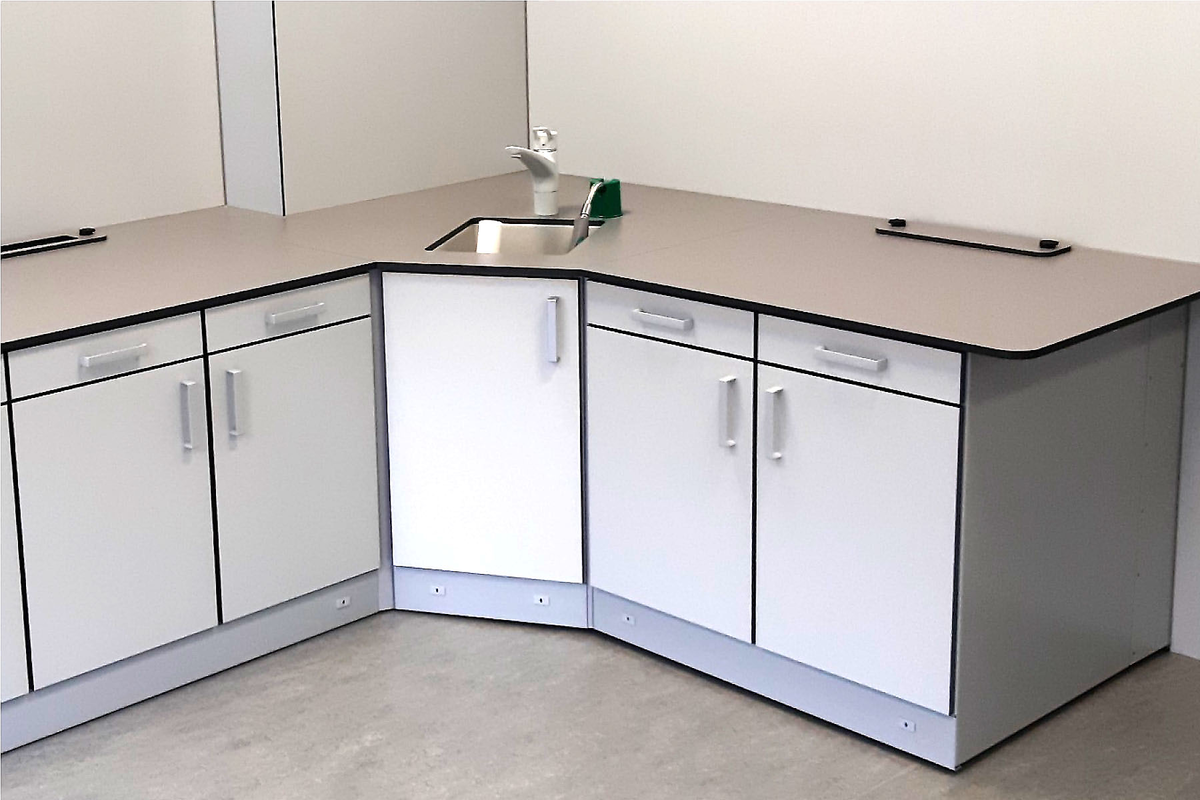 HPL 被用作工作台面的标准材料-这是一种高性能的材料,具有出色的抗冲击和耐磨性能,具有卫生密封性,并且易于清洁。白色铝制框架与黑色边框的 HPL 结合在一起,营造出现代而精致的外观。前板为柔和的灰色,侧板为淡雅的灰色。
